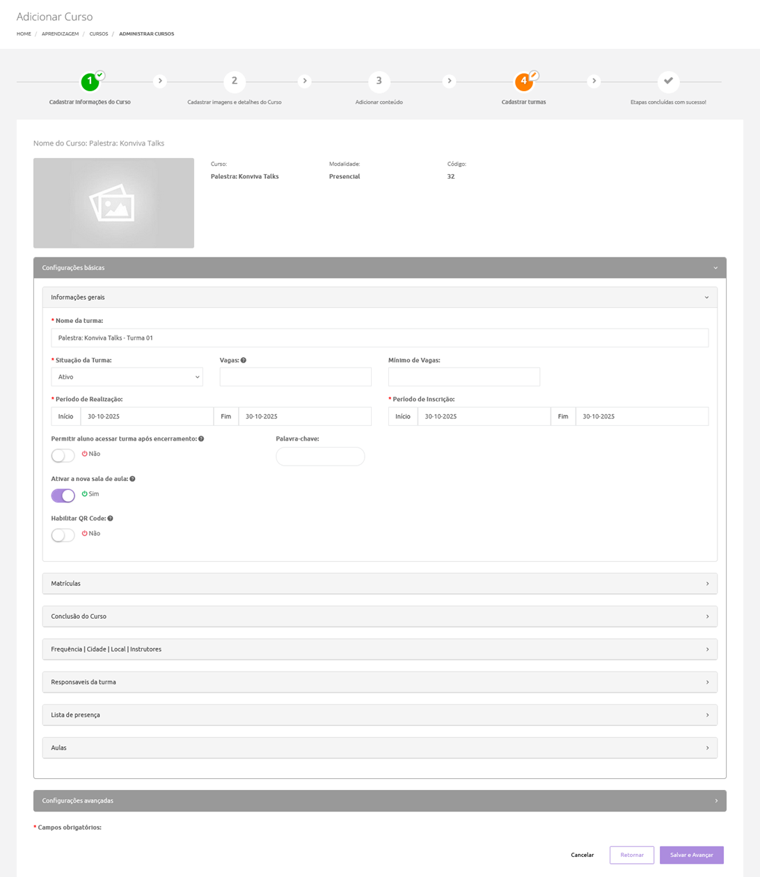 Cadastrar mais turmas: caso você queira criar mais turmas para esse curso, você será direcionado para criar uma nova turma.