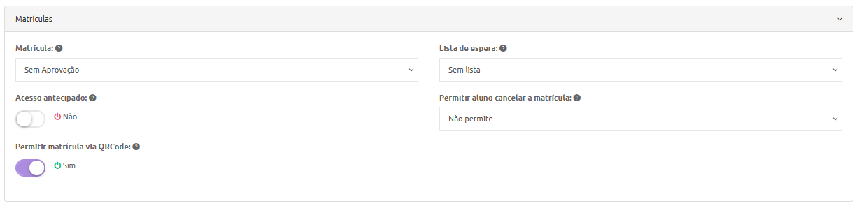 Permitir aluno cancelar a matrícula: caso selecione "Não permite" o sistema não deixará o aluno cancelar a matrícula diretamente.