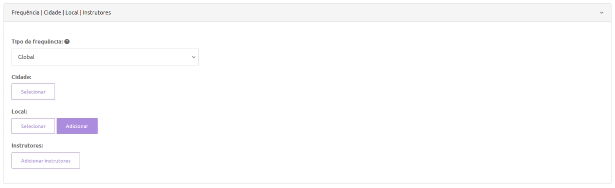 - Global: a frequência é registrada globalmente, informando-a uma única vez, independente do número de reuniões cadastradas na turma, se o aluno acessar somente uma reunião, ele ganhará 100% de frequência.