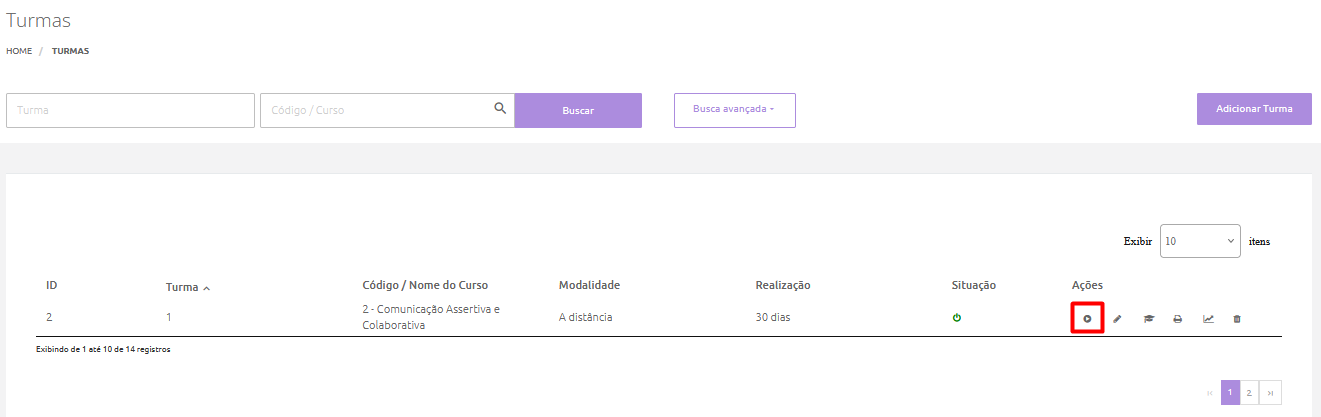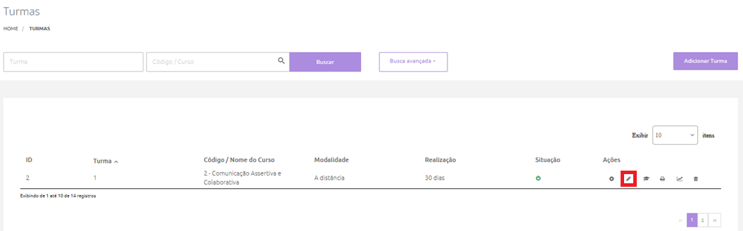 Acesse o menu Aprendizagem > Turmas > Administrar Turmas e clique no botão Editar Turma, conforme ilustrado na imagem abaixo: