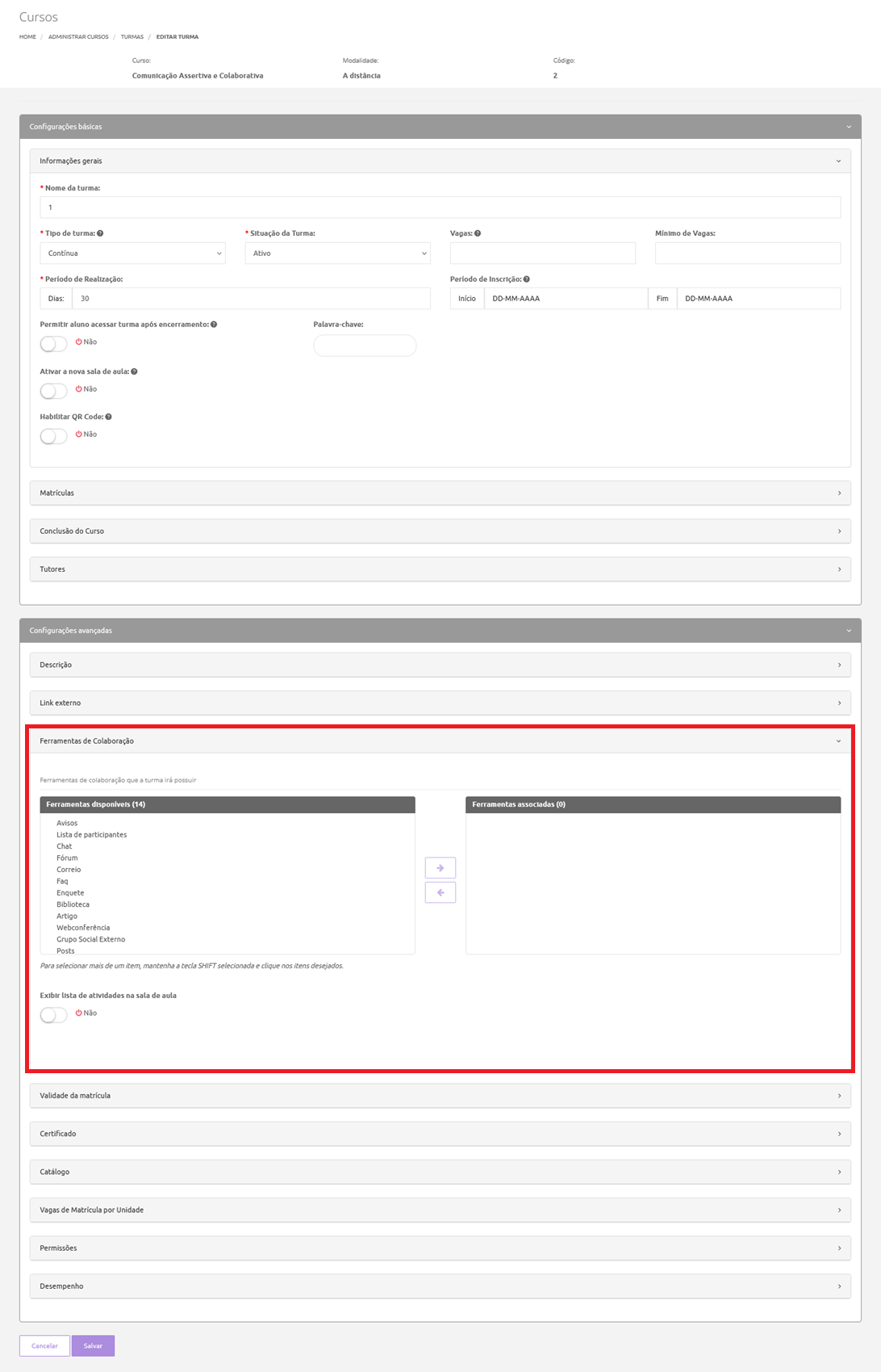1. Ir em menu Aprendizagem > Turmas > Administrar, acessar a sala de aula da turma em que quer configurar a ferramenta;
