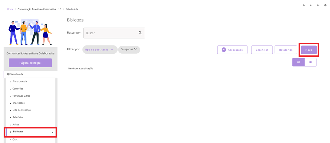 Para adicionar materiais na biblioteca da turma, acesse o menu Aprendizagem > Turmas > Administrar Turmas e entre na Sala de Aula da turma desejada.