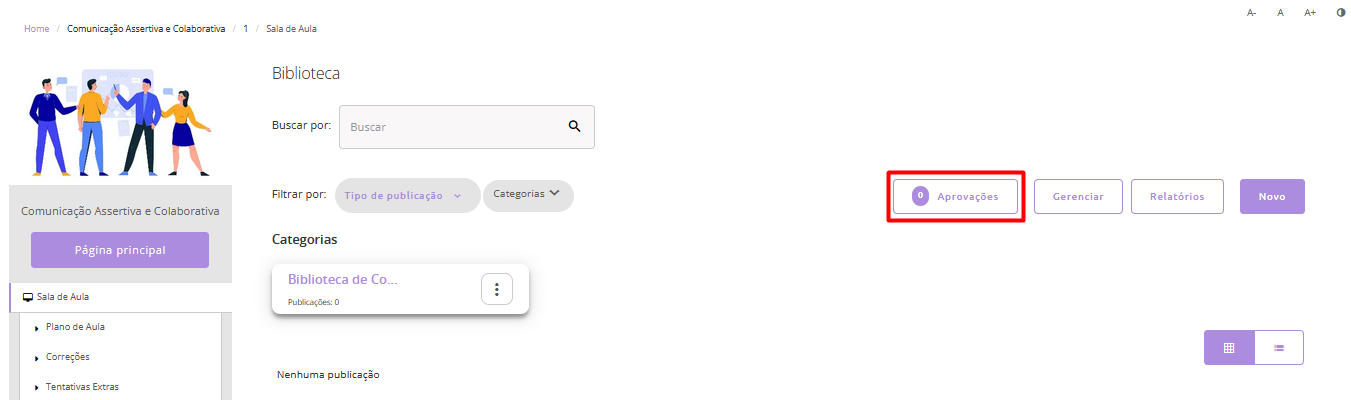 As publicações enviadas pelos alunos ficam disponíveis na área de Aprovações, onde o número exibido indica as pendências que aguardam análise e validação do responsável (tutor/instrutor), que poderá aprovar ou reprovar cada envio.