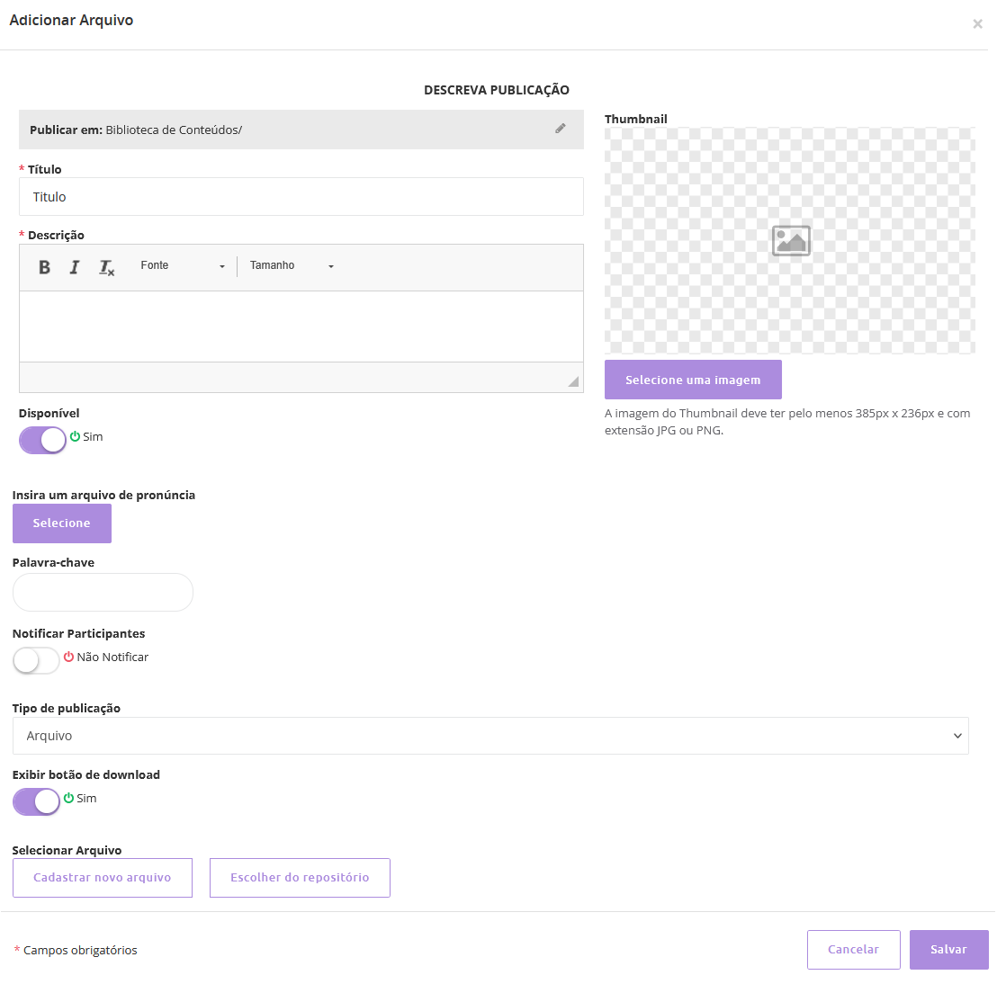 Descrição: campo obrigatório, devendo ser acrescentada uma breve descrição sobre o arquivo.