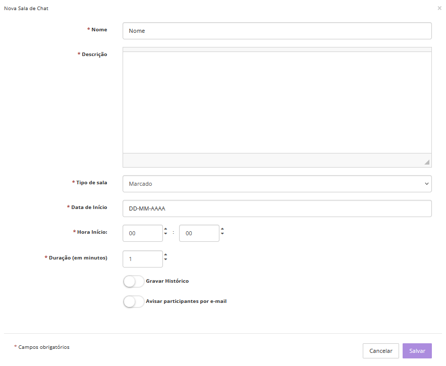 - Marcado: quando a sala de chat possui data inicial, horário e duração para ficar disponível aos alunos;