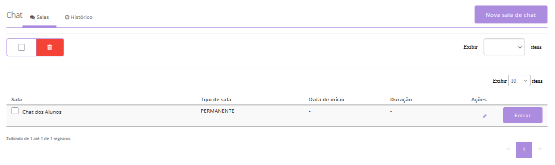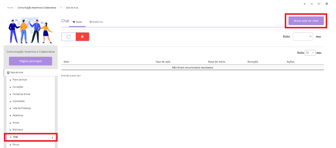 - Permanente: quando a sala de chat fica disponível na sala de aula para todos os usuários da turma em qualquer data e horário.