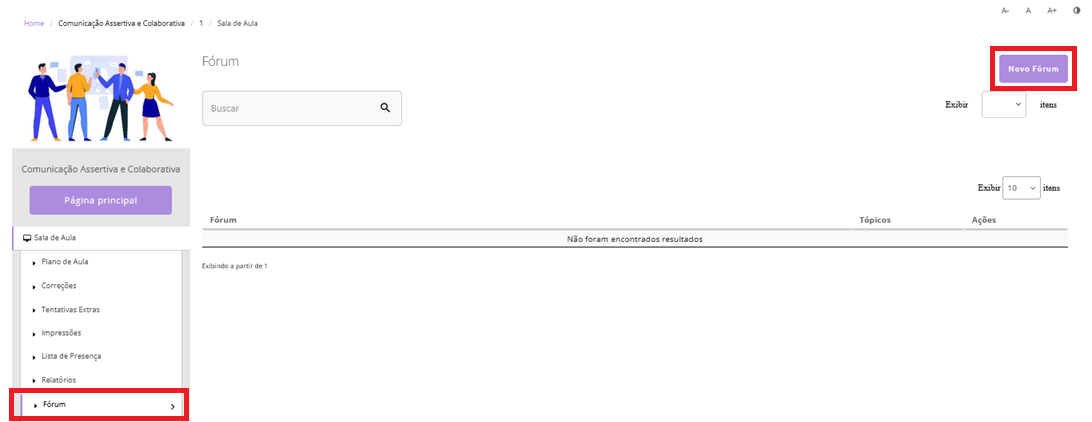 Para criar um novo fórum, acesse a Sala de Aula e, no menu lateral esquerdo, clique em Fórum, localizado junto às demais ferramentas de colaboração.