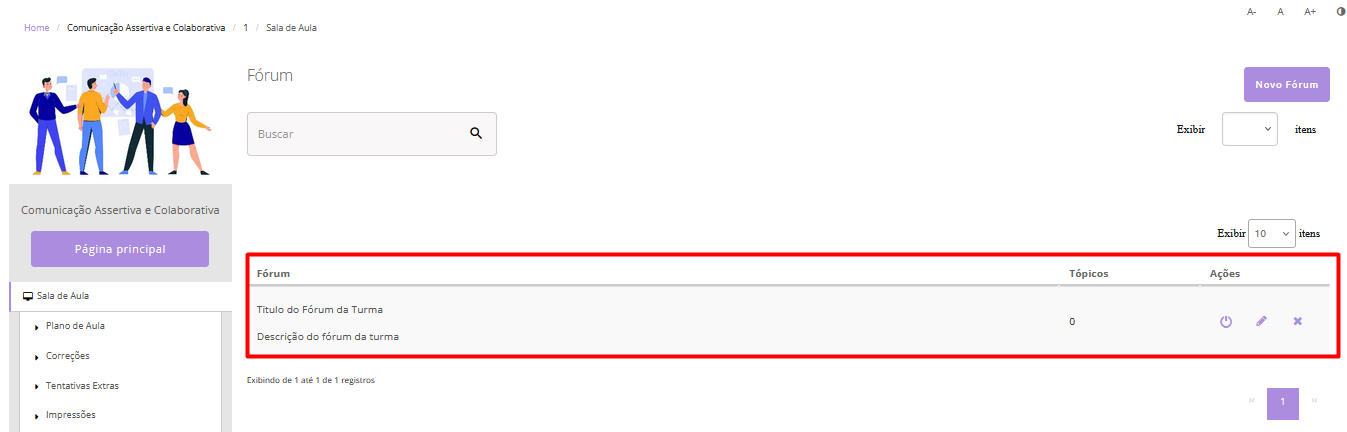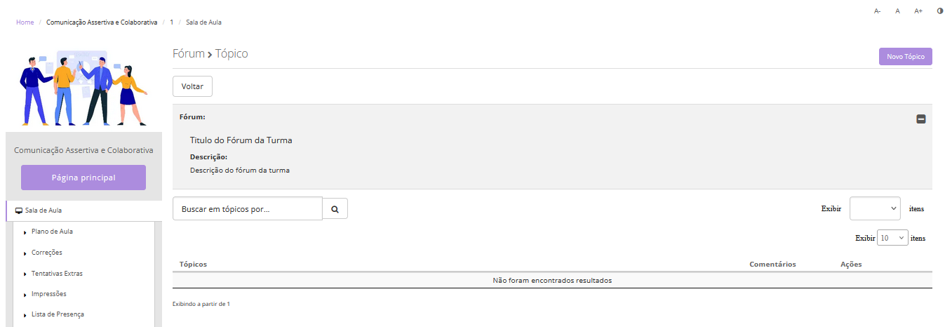 É necessário que o responsável da turma cadastre pelo menos um fórum e um tópico para que os alunos possam comentar.