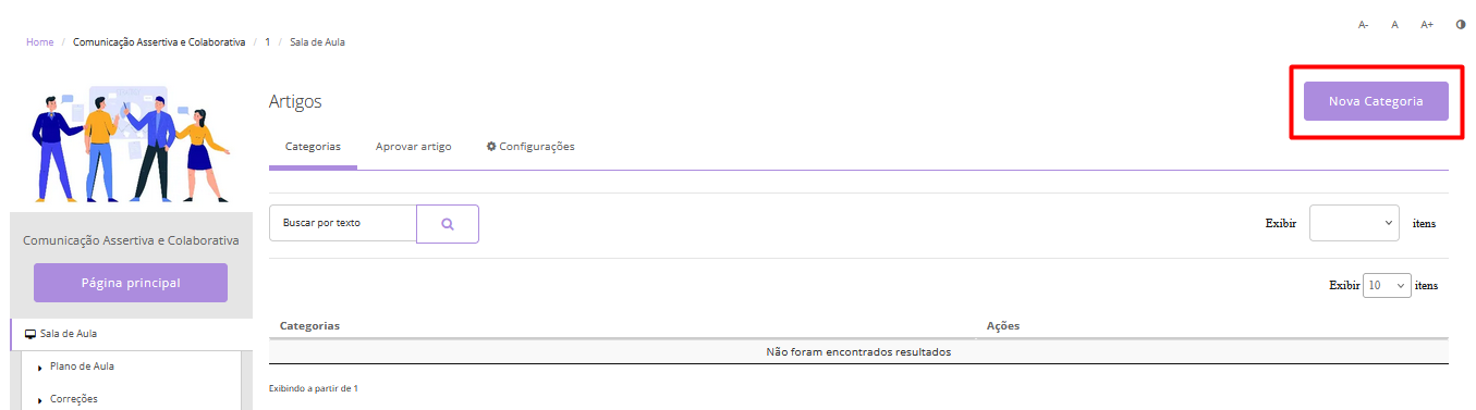 O tutor pode definir se os artigos enviados precisarão de aprovação antes da publicação e se todos os usuários da turma poderão criar novas categorias para organizar os conteúdos.