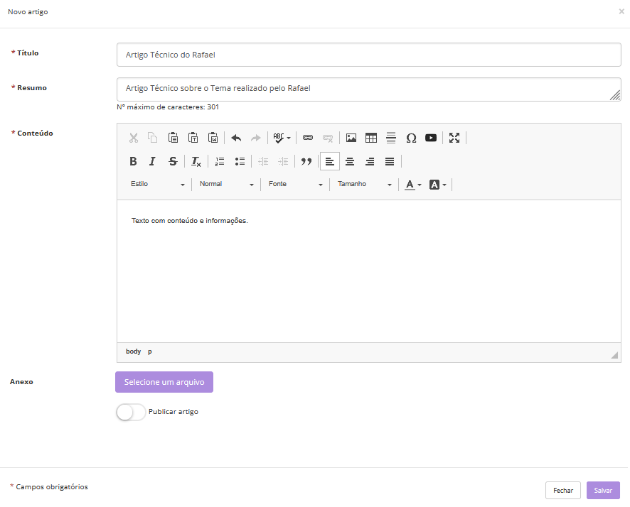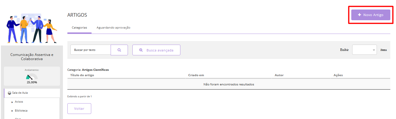 E poderá realizar a inclusão de um novo artigo clicando no botão "+ Novo Artigo"