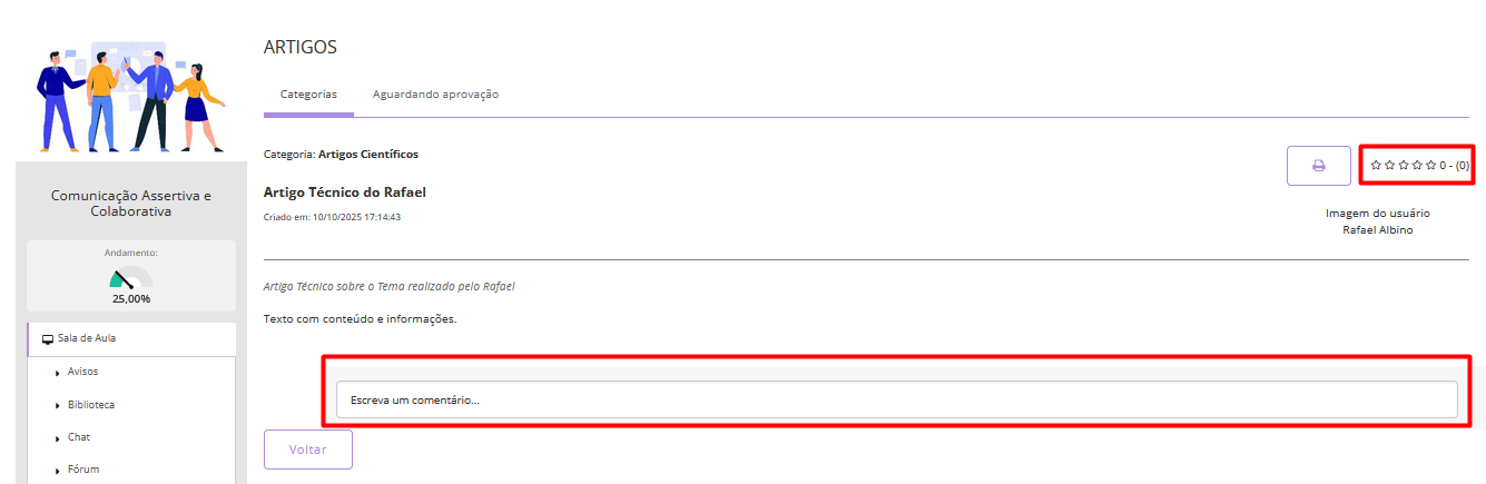 - Ao clicar nas estrelas, no final do artigo, é possível registrar a avaliação. Estas notas ficam registradas logo acima da foto do autor;