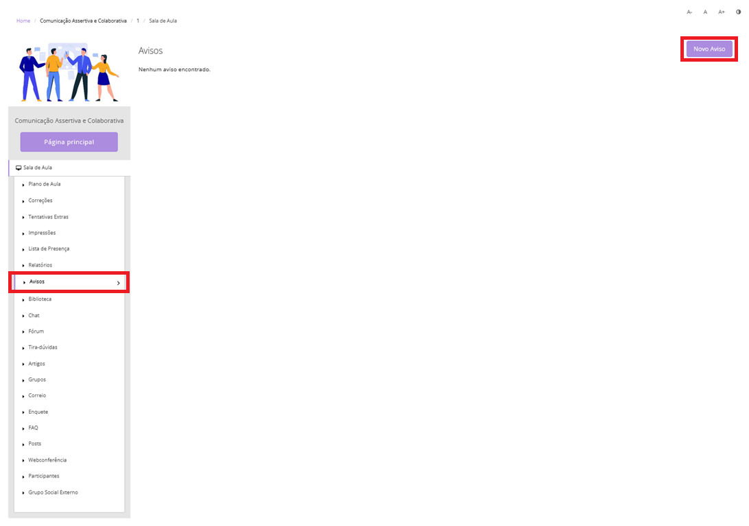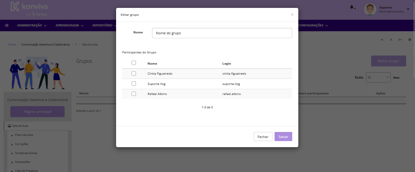 Para criar um novo grupo, acesse o menu lateral esquerdo da sala de aula e clique em Grupos.
