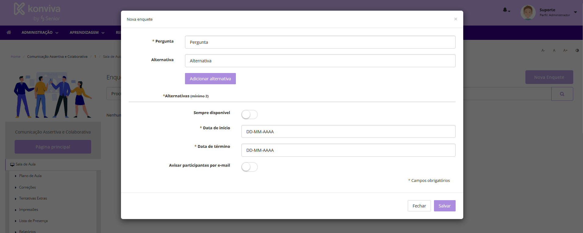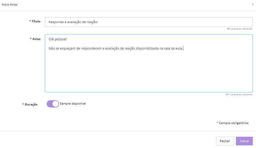 No campo Duração, defina por quantos dias o aviso permanecerá disponível na sala de aula. Caso prefira, é possível marcar a opção para que o aviso fique sempre disponível.