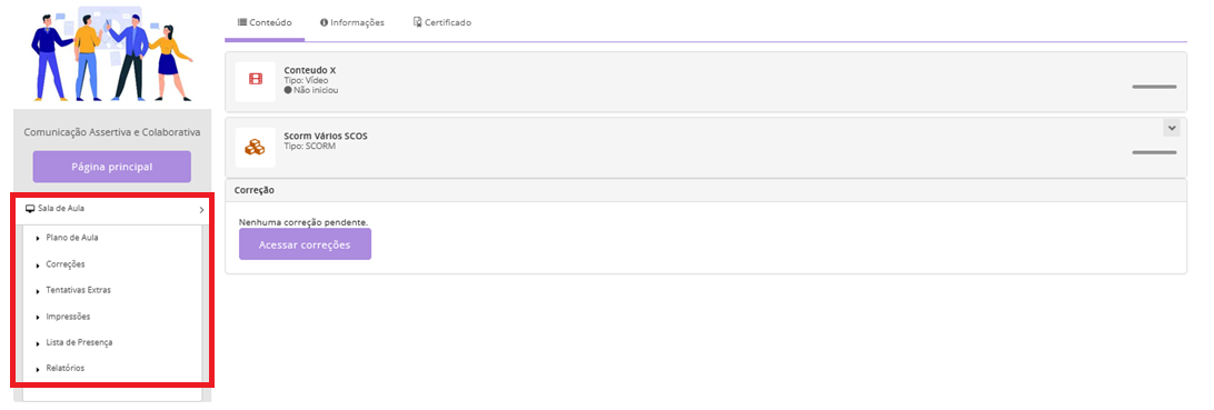 Na Konviva, o espaço virtual onde o aluno realiza suas atividades de aprendizagem é denominado sala de aula. Esse ambiente é projetado para os alunos visualizarem os conteúdos para seu estudo no curso e promover a interação educacional dos alunos.
