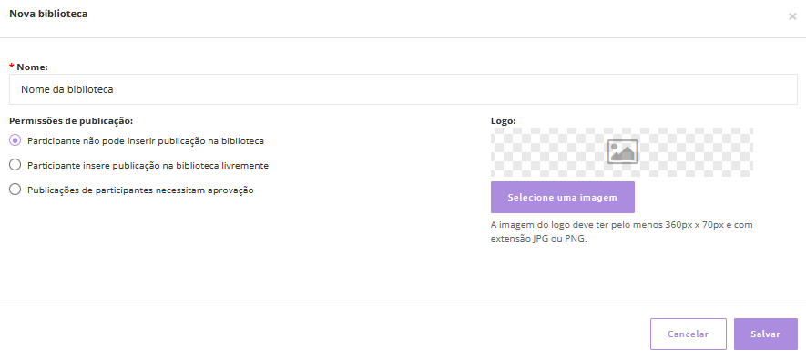 Informe o nome da nova biblioteca e defina as permissões de publicação, determinando se os alunos poderão ou não publicar arquivos livremente ou se as publicações deverão passar por aprovação do responsável antes de serem exibidas.