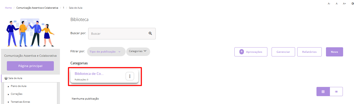 A Biblioteca é o espaço onde os responsáveis pelo curso e os alunos podem adicionar diferentes tipos de mídias, como imagens, vídeos, arquivos em PDF, links e outros materiais que complementam o conteúdo didático do curso.