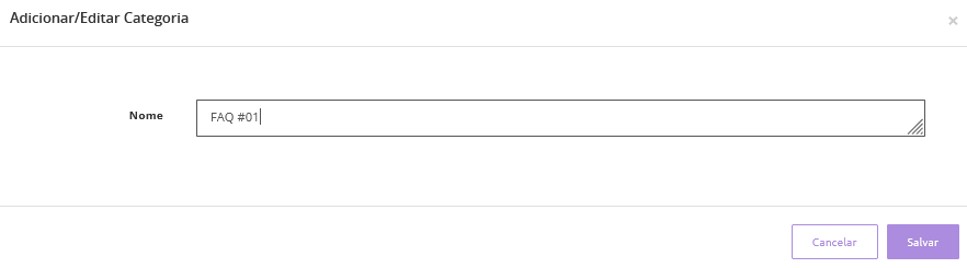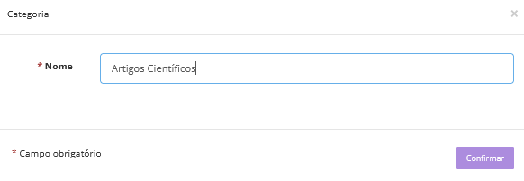 Ao clicar em "Nova Categoria" será exibido uma nova janela onde você deve inserir o nome da categoria.