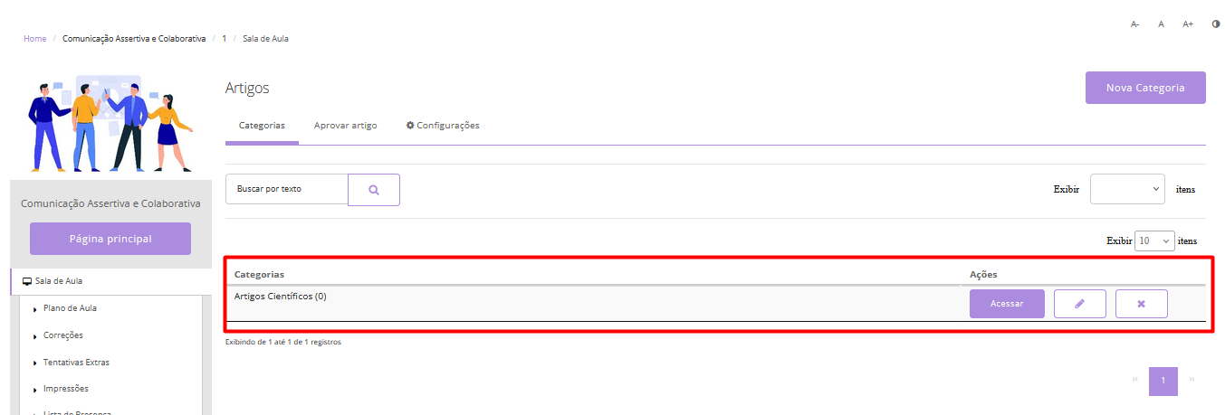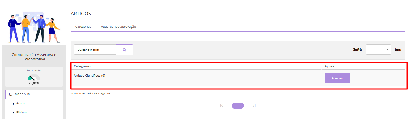 A ferramenta Artigos permite que alunos e professores adicionem e compartilhem seus artigos científicos dentro da turma. Os documentos enviados ficam disponíveis para download pelos participantes, mas não são exibidos diretamente no player da plataforma.