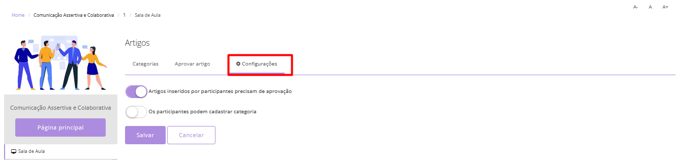 O responsável pela turma pode definir algumas configurações de restrição acessando a guia Configurações. Nessa área, é possível determinar se os artigos inseridos pelos participantes precisarão de aprovação antes da publicação e se os participantes poderão cadastrar novas categorias na biblioteca de artigos.