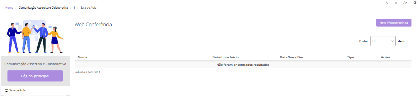 2. Procurar do lado esquerdo da tela por "Webconferência". Clique, e abrirá a seguinte tela: