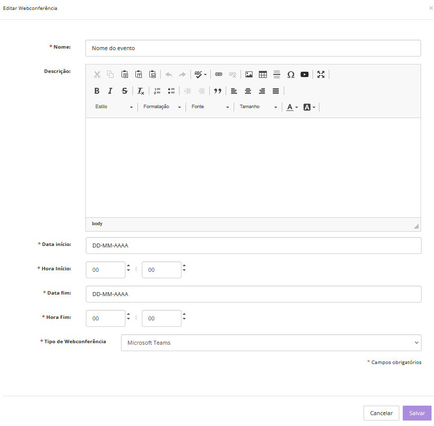 Data de término e hora de término: definem até quando a conferência ficará disponível.