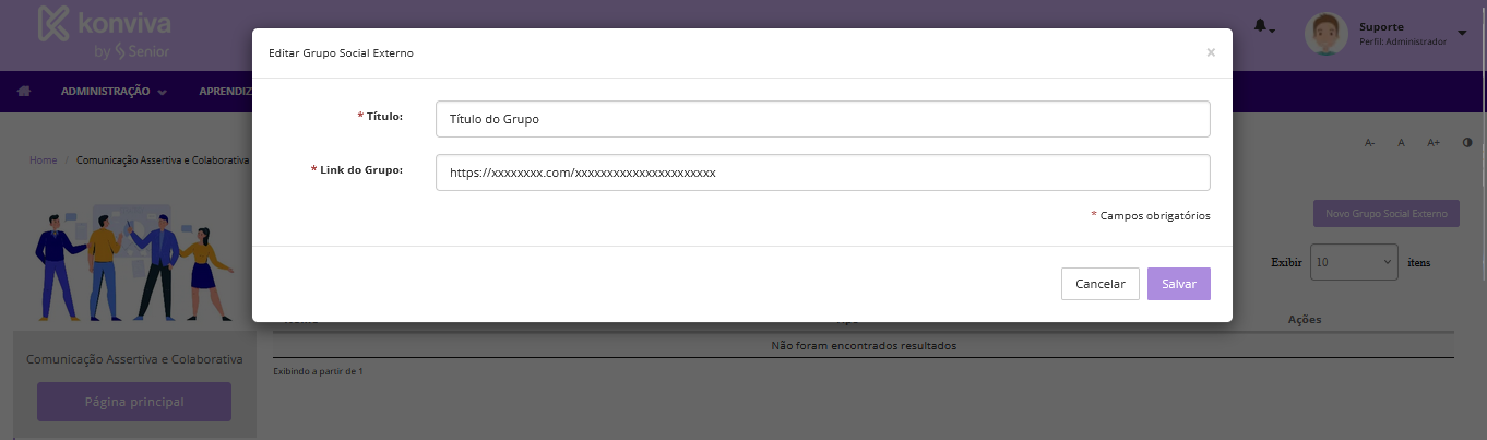 É uma ferramenta que possibilita direcionar os alunos para um grupo de Whatsapp. Para isso, o responsável de turma precisa acessar a sala de aula, clicar em "Grupo Social Externo", onde abrirá a seguinte tela: