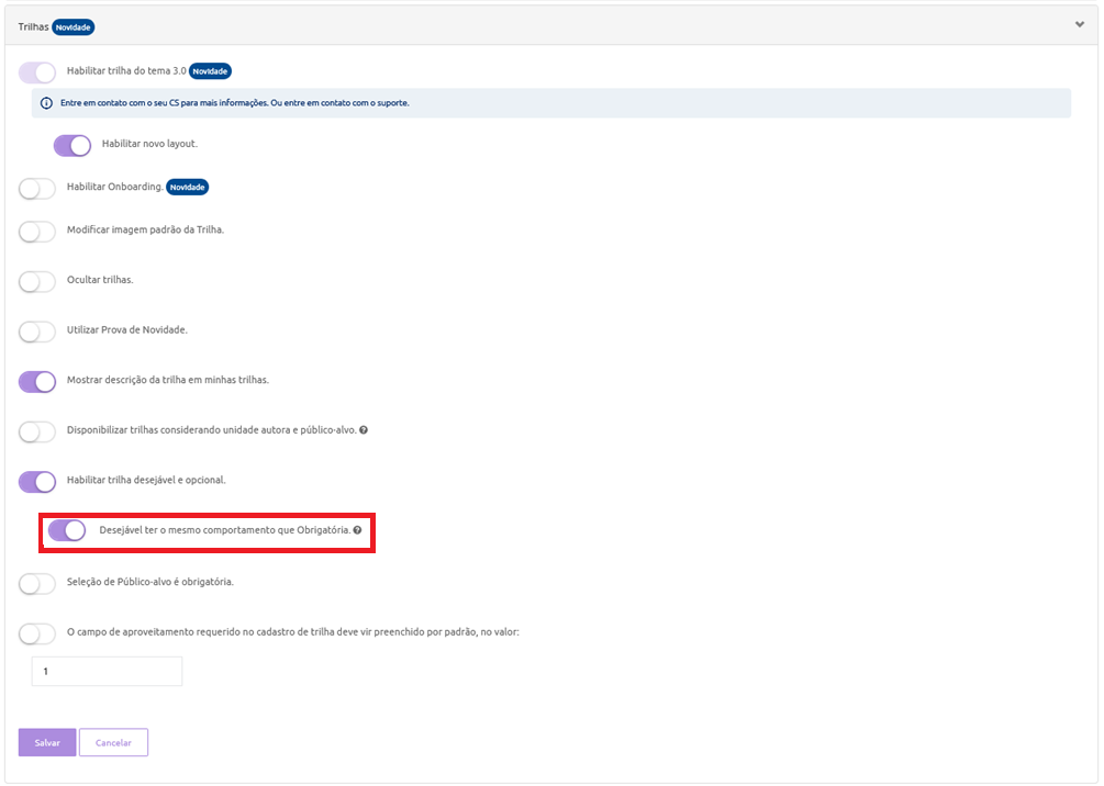 Se você deseja que ao selecionar um público-alvo na configuração de desejável, o aluno é automaticamente associado à trilha, você deverá ativar a opção "Desejável ter o mesmo comportamento que Obrigatória." conforme a imagem: