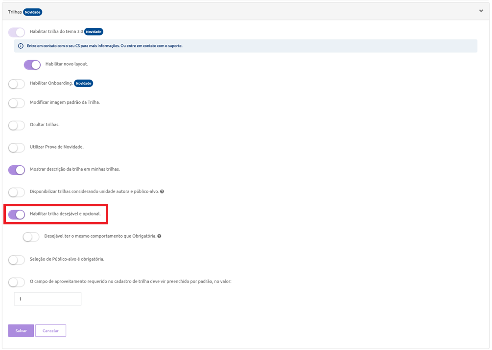 Para realizar a habilitação da funcionalidade o administrador deve acessar o menu Configurações > Configurador Geral > Trilhas. E habilite a opção "Habilitar trilha desejável e opcional".