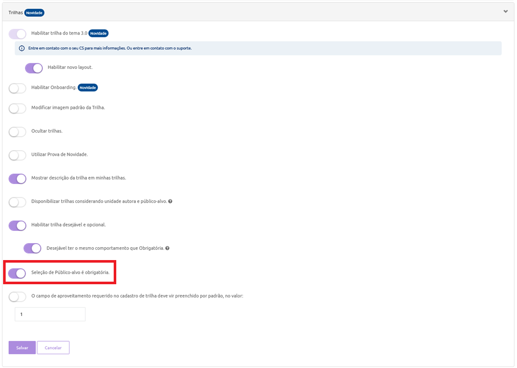 O sistema passa a exibir no cadastro de trilha essas duas opções de categorização e direcionamento para públicos-alvo específicos.
