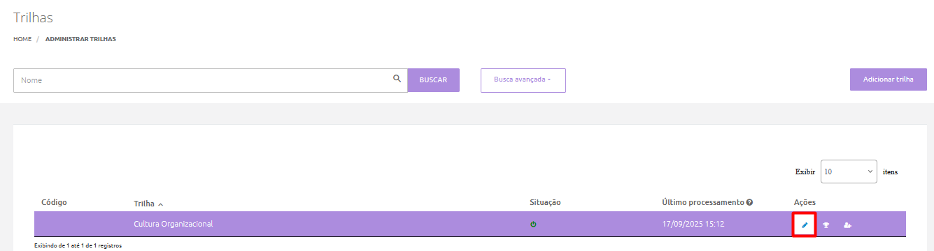 Agora com a configuração habilitada, você deve ir até a trilha que você deseja incluir a informação. Para isso vá até o menu Aprendizagem > Trilhas procure pela sua trilha e clique em "Editar" conforme a imagem abaixo: