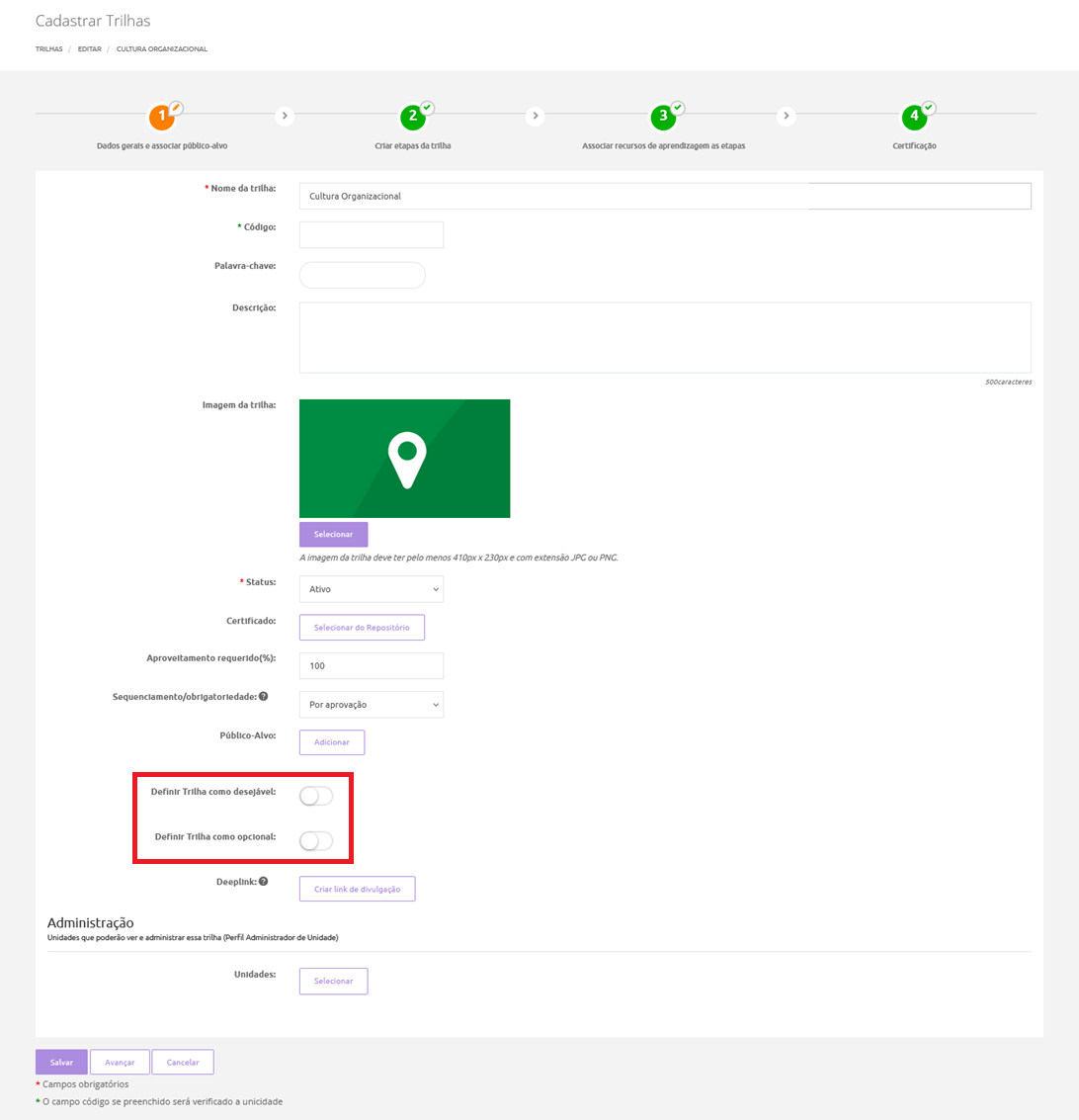 Caso a trilha seja desejável ou opcional para todos os usuários não há necessidade de selecionar um público alvo, porém se a trilha for desejável ou opcional para algum público específico, você deve selecionar o público-alvo.