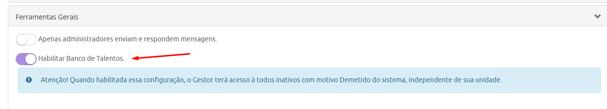 Primeiramente, para que esta funcionalidade possa ser utilizada, é necessário habilitá-la no Configurador Geral, indo em menu CONFIGURADOR GERAL>FERRAMENTAS GERAIS>HABILITAR BANCO DE TALENTOS, conforme imagem abaixo: