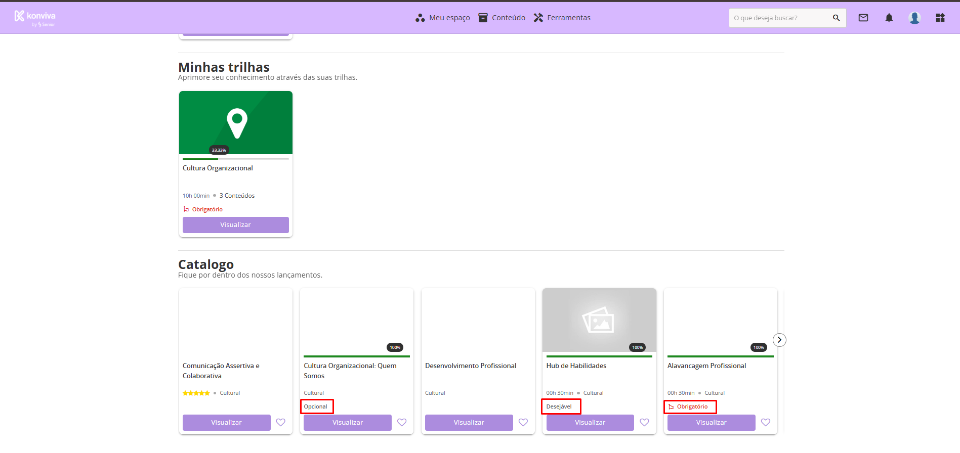 Ao classificar o curso como obrigatório, desejável e opcional, será exibido a tag no card no curso (disponibilizado no catálogo, trilha ou home do aluno) com a classificação selecionada.