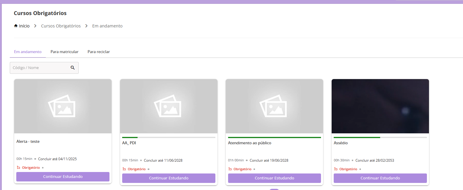 Ao acessar como aluno e acessar o menu Cursos em Andamento irá exibir sempre que usuário tiver uma matrícula em aberto em algum curso que foi sinalizado para ele como obrigatório.