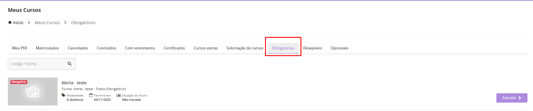 Exibição dos cursos Obrigatórios para os alunos.