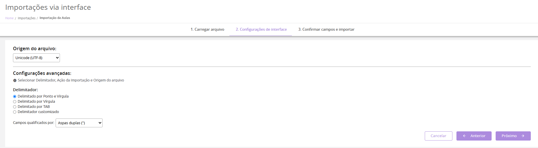 Neste segundo passo você deve informar os dados do Delimitador do arquivo CSV, por padrão o excel exporta como CSV com o delimitador por: "Delimitado por Ponto e Vírgula", caso você tenha exportado por outro tipo de delimitador você deve selecionar como foi exportado.