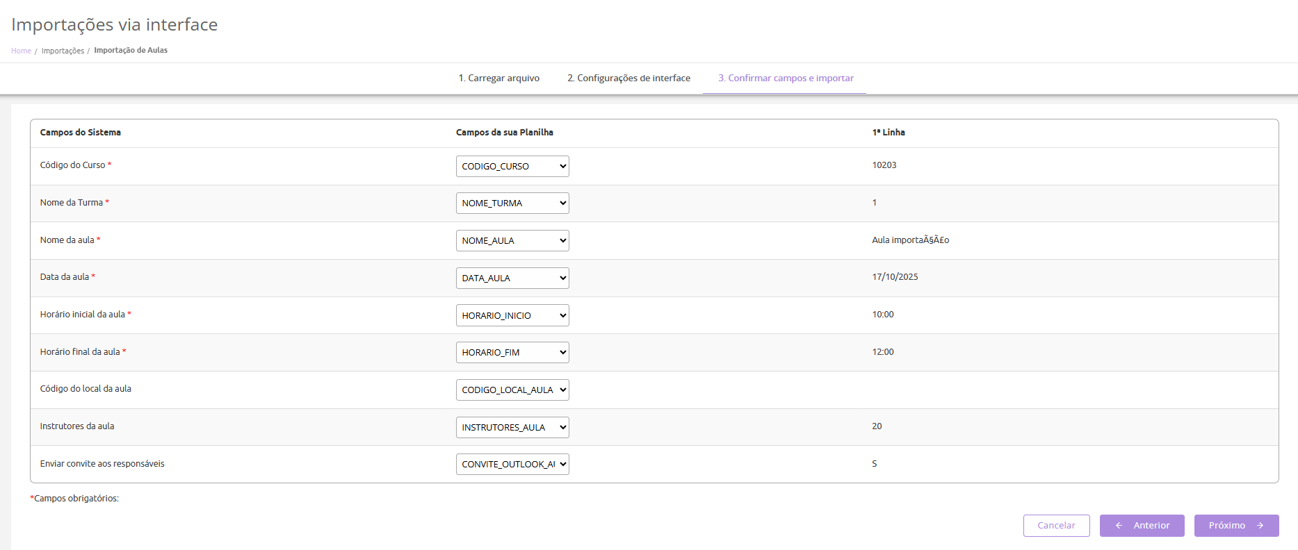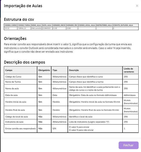 Obrigatoriamente os seguintes campos devem ser preenchidos: Código do Curso, Nome da Turma, Nome da aula, Data da aula, Horário inicial da aula, Horário final da aula.