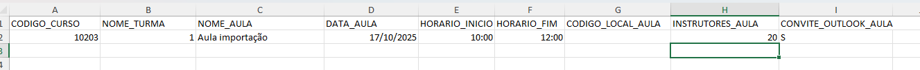 No exemplo acima será criado 1 turmas em 1 curso. No curso de código 10203 será criado uma aula no dia 17/10/2025 com horário de inicio as 10:00 e fim as 12:00 e com o instrutor 20, com o envio de mensagem de outlook.