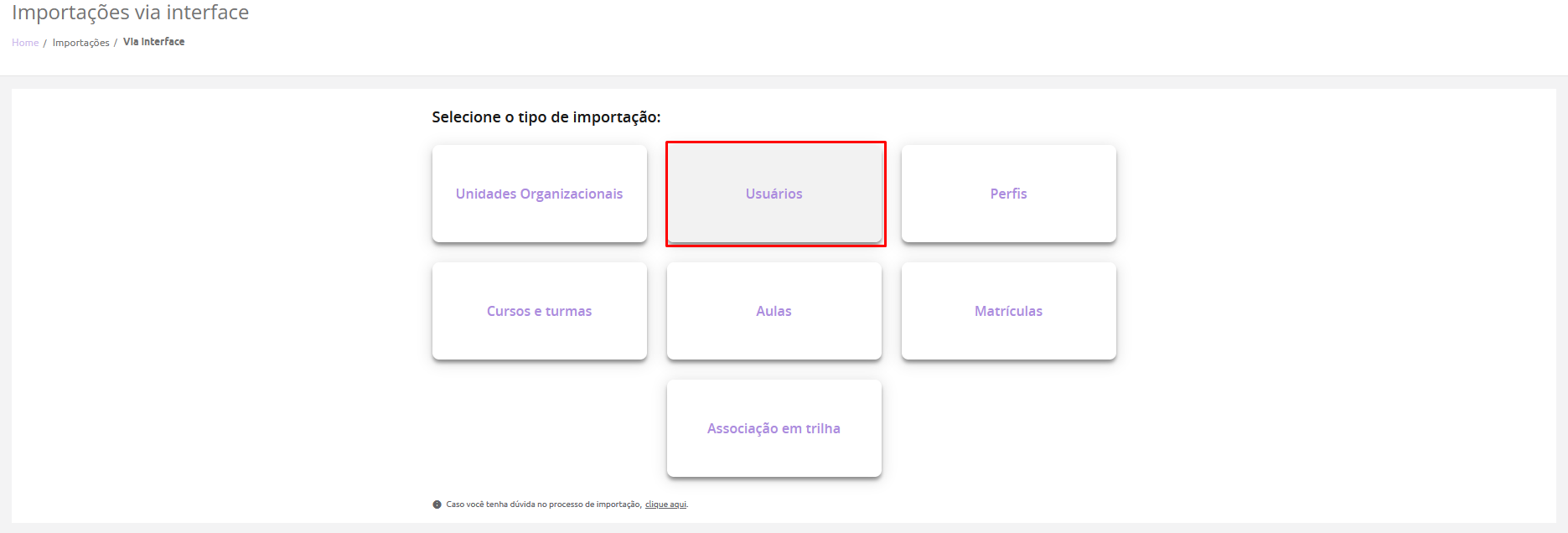 Para realizar importação de usuários você deve acessar o menu Administração > Importações > Administrar e selecione a opção 2. Usuários.