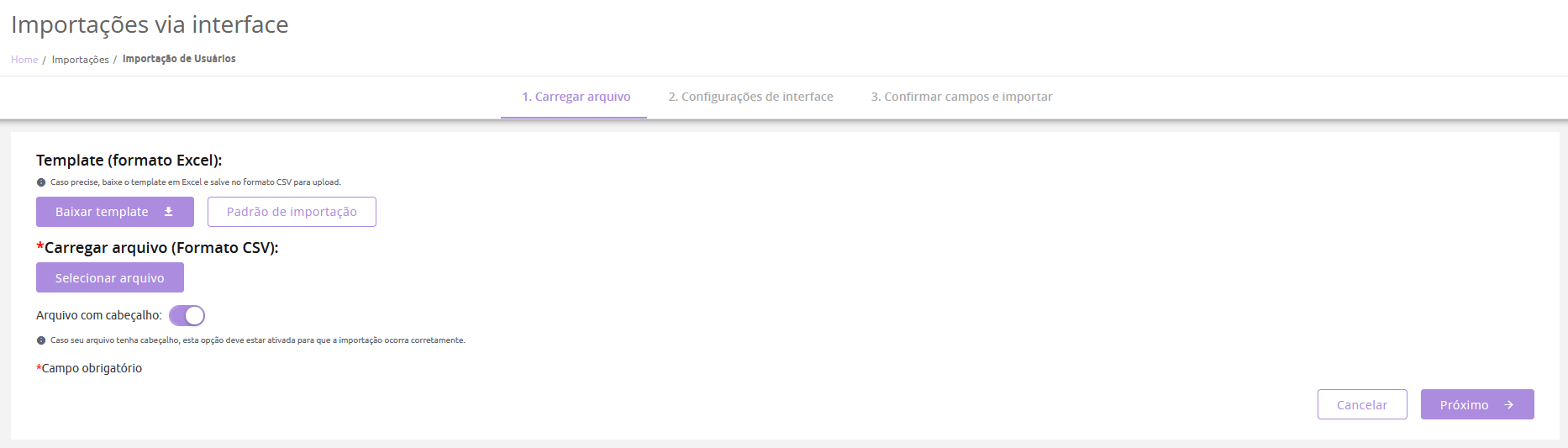 Primeiramente você deve baixar o template da importação em Excel clicando no botão "Baixar template", preencher os dados que você deseja importar de todos os usuários e, após deve salvar em formato CSV.