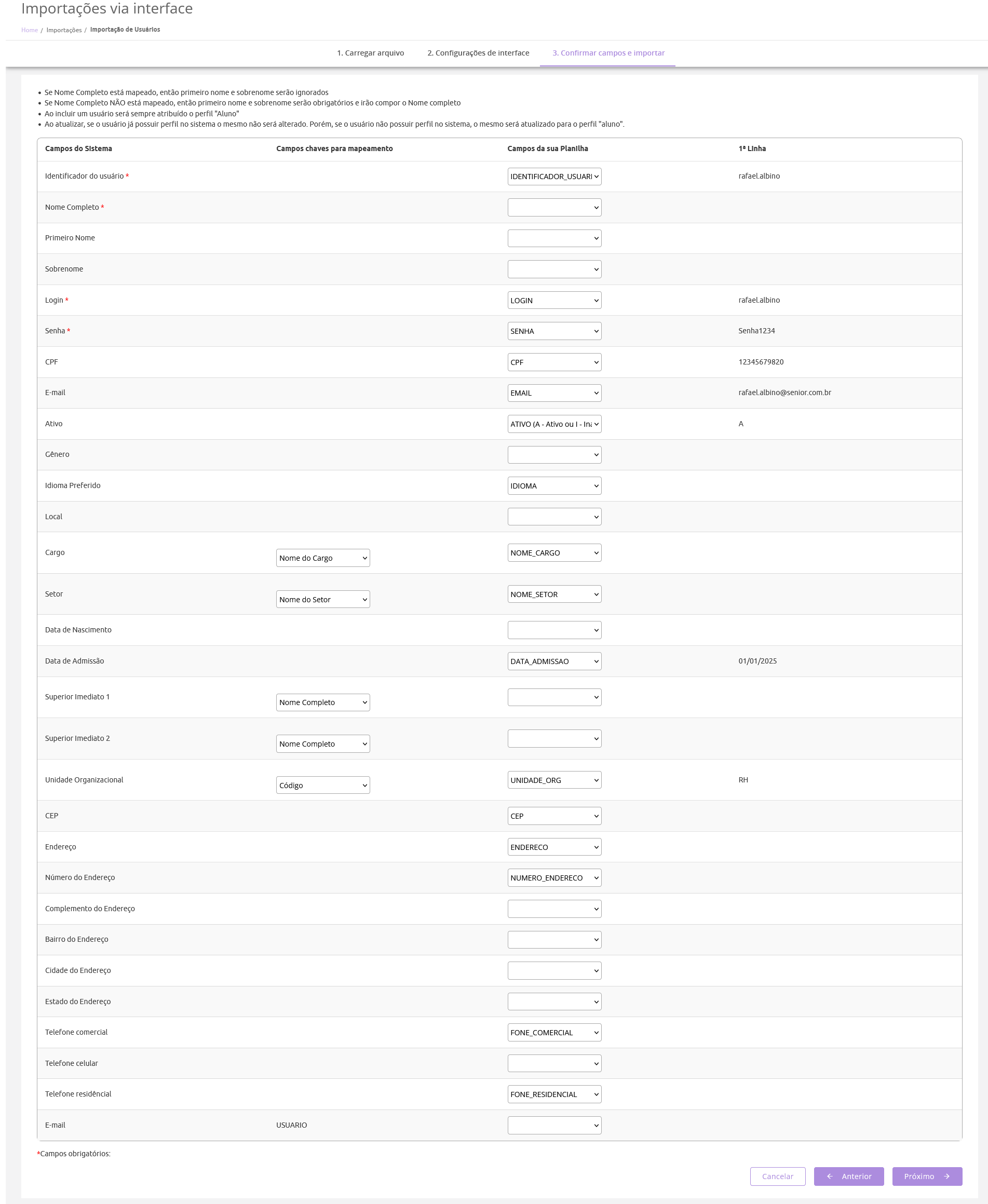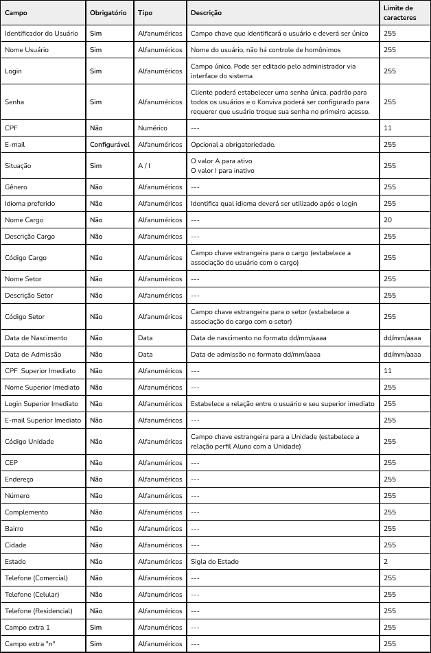 - Para importação de usuários, os campos nome, login, identificador, senha, e-mail e status são obrigatórios.