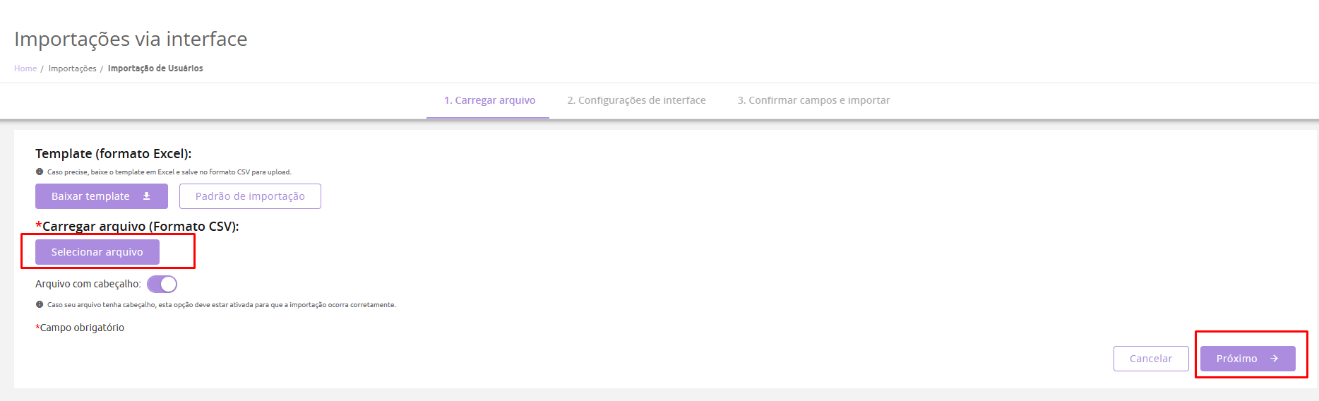 ATENÇÃO: Por questões de estabilidade na importação durante o procedimento, recomendamos que o arquivo de importação (.csv) não ultrapasse a 5MB, pois pode haver uma demora no processamento e erro durante a importação.
