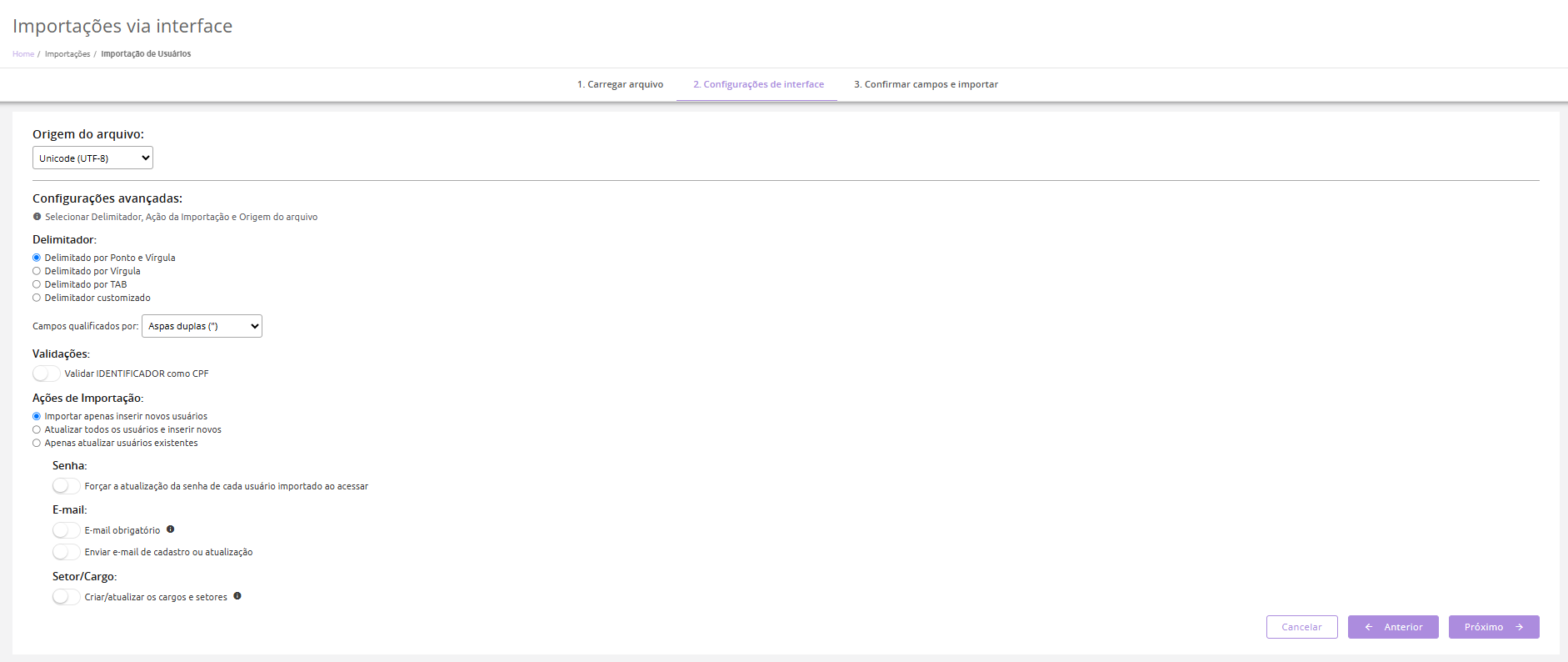 - E-mail obrigatório: Caso esta opção não seja selecionada, o sistema permitirá a importação de usuários com e-mails em branco e sem validação da unicidade de dados. Se selecionada, os e-mails deverão ser únicos e obrigatórios.