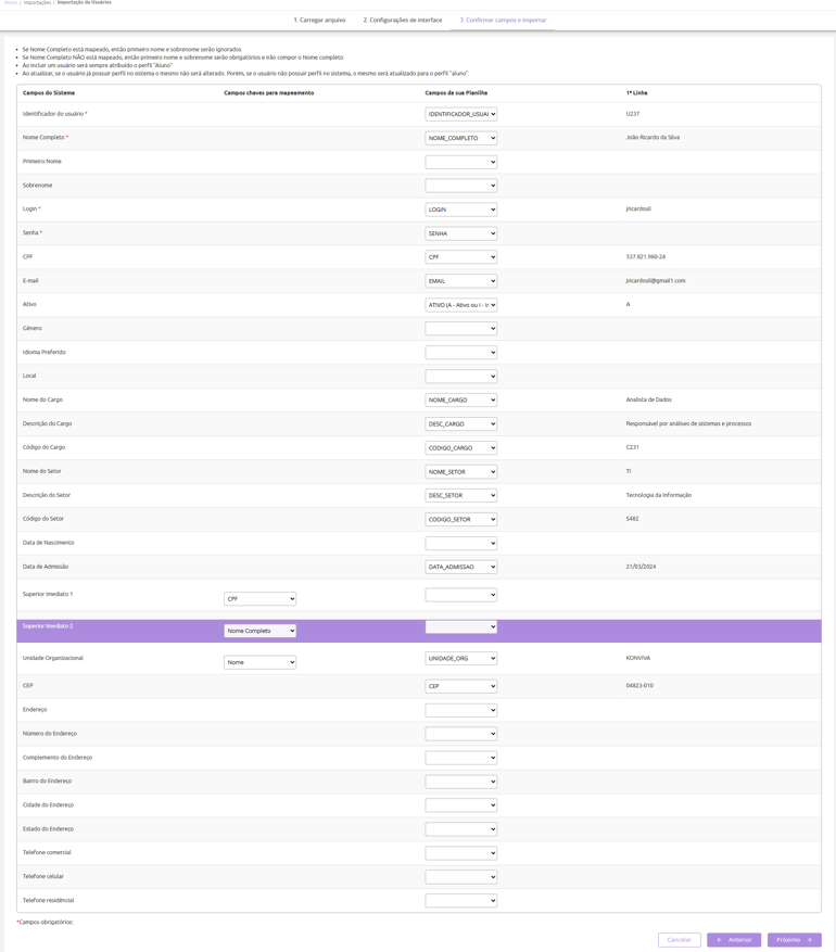 Nesta terceira etapa você deve mapear os campos do sistema com o campos da sua planilha.