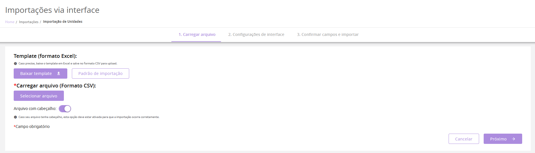 Para clientes que tenham uma estrutura maior em sua hierarquia, existe a possibilidade de subir as unidades via planilha na central de importação da Konviva.