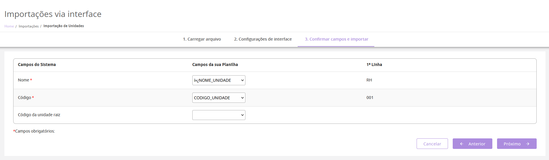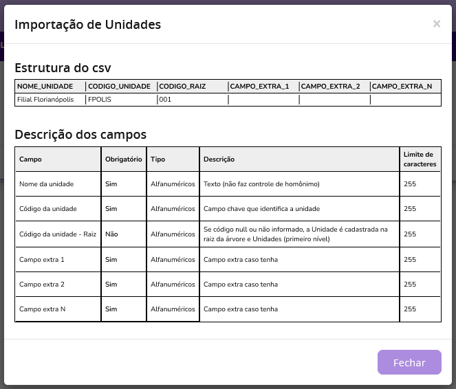 1) Na coluna "NOME_UNIDADE" deve ser preenchido o nome da unidade que vai aparecer na hierarquia da interface;