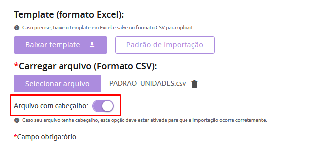 Clicando em "Padrão de importação" você consegue visualizar os campos que devem ser inseridos na planilha de importação, quais são obrigatórios e qual o formato cada um deve ter:
