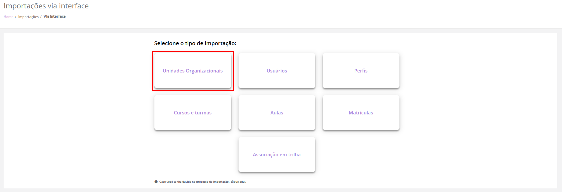 Para realizar a importação de unidades, acesse o menu Administração > Importações > Administrar e selecione a opção 1. Unidades Organizacionais.