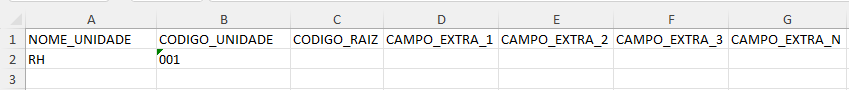 2) Na coluna "CODIGO_UNIDADE" preencha o código da unidade, ele pode ser letras, números e ambos juntos. Cada unidade deve ter seu próprio código, caso aconteça de mais de uma unidade ter o mesmo código, apenas uma subirá para o sistema;