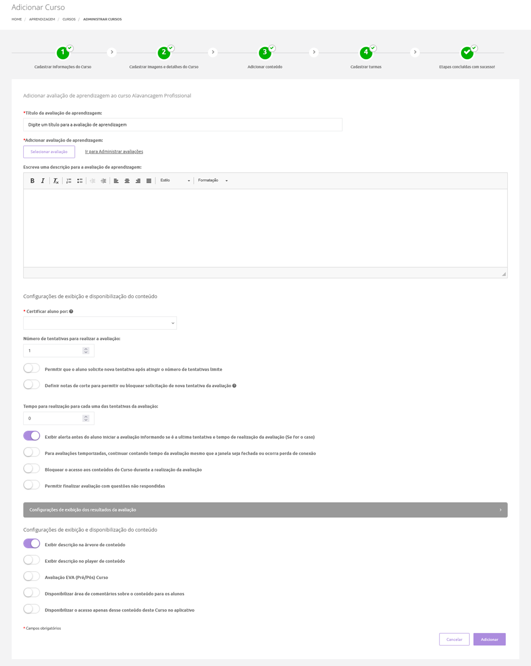 Para adicionar a avaliação de aprendizagem em um curso, ela já deve estar cadastrada no repositório.
